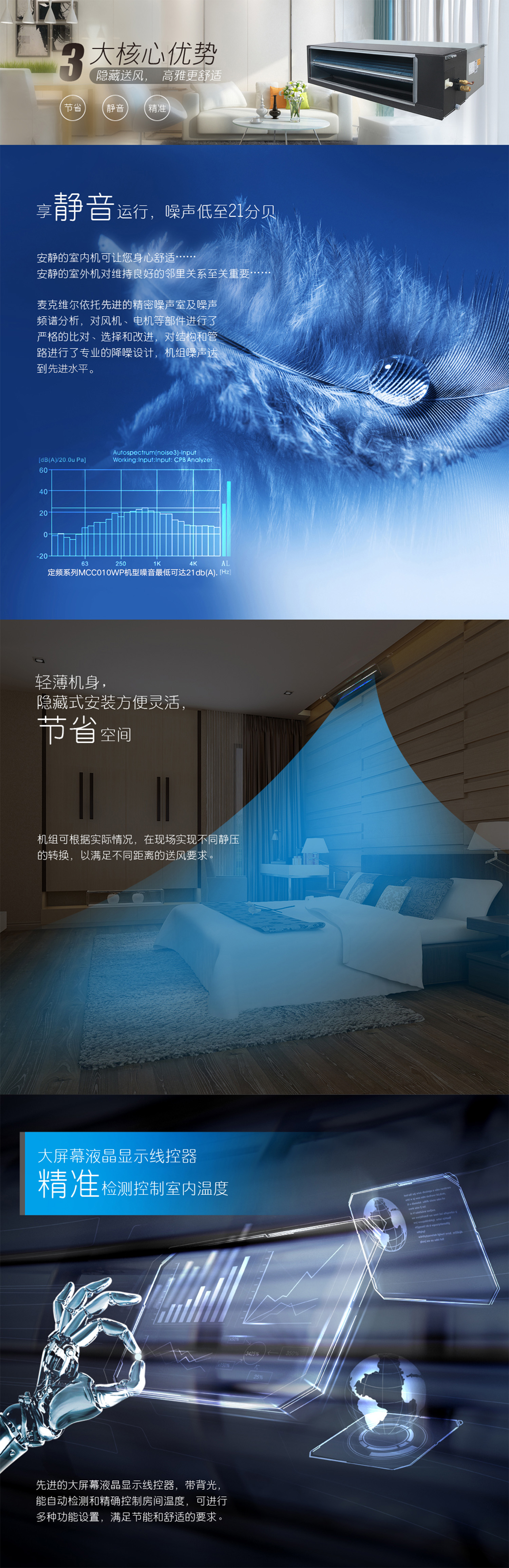 產品理念:采用變頻科技,讓機組時刻處于高效的工作狀態。應用窄型結構設計,大幅度節約安裝所用空間,可與各類裝修風格融合。依托于精密噪音實驗室和先進的多通道噪聲分析模擬軟件,通過結構和控制邏輯的優化創新,針對性的對室內機噪聲源進行遏制和隔斷,打造安靜的室內空間。